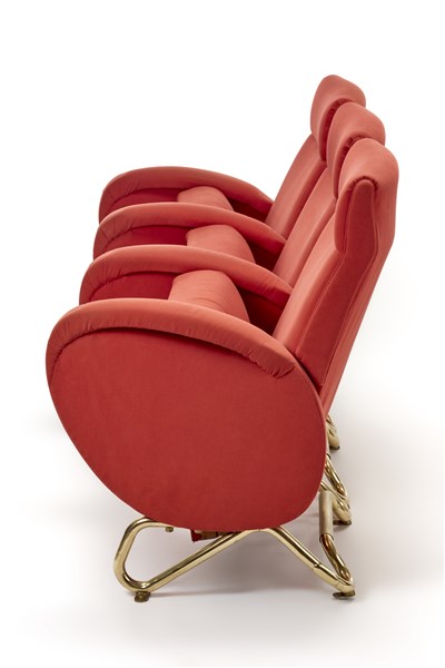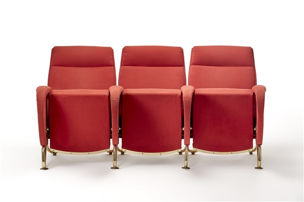 Una fila di tre poltrone con sedile a ribalta. Torino, 1957-58. Tubo di ottone, imbottiture rivestite in velluto sintetico rosso. (cm 170x86x60) (lievi difetti e restauri)