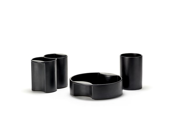 Lotto di quattro ceramiche modello "Quasitondo". Manifattura Ceramiche Franco Pozzi, Gallarate, secolo XX. Ceramica smaltata nera. Recante marchio della manifattura sotto la base. (misure diverse)