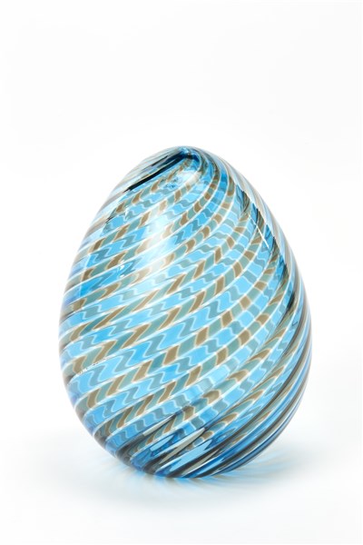 Egg. Murano, 2002. Blown glass with blue, red and colorless twisted canes. Signed in under the base "Venini 2002" and bearing the manufacturer's adhesive label. (h 16.5 cm.)