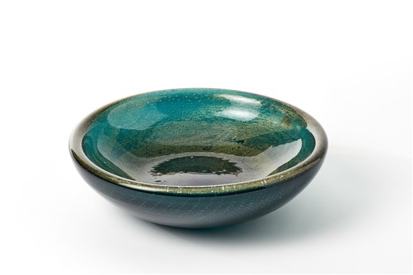 Coppa centrotavola. Anni '50/'60. Vetro verde bulicante con applicazione di foglia d'oro. (d cm 28)