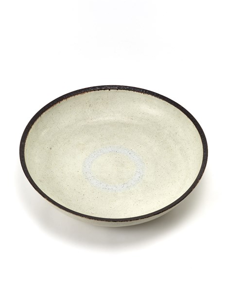 Large centerpiece. Italy, 1960s/1970s. White glazed ceramic with brown rim. Signed under the base. (d 42 cm.)