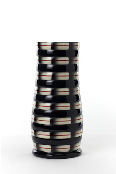 Portaombrelli futurista. Italia, anni '50. Ceramica smaltata all'aerografo sotto vetrina con motivo geometrico in nero, rosso e bianco. Firmato sotto la base "SACRU ROMETTI UMBERTIDE". (h cm 49)