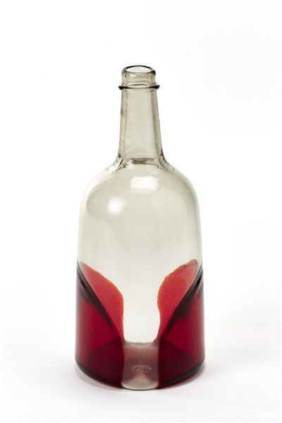 Bottiglia della serie "Pavoni". Venini, Murano, 1981. Vetro soffiato trasparente talpa e rosso. Disegno 526.40 del catalogo di fornace. Firmato e datato a punta sotto la base "venini italia tw 81". (h cm 21)