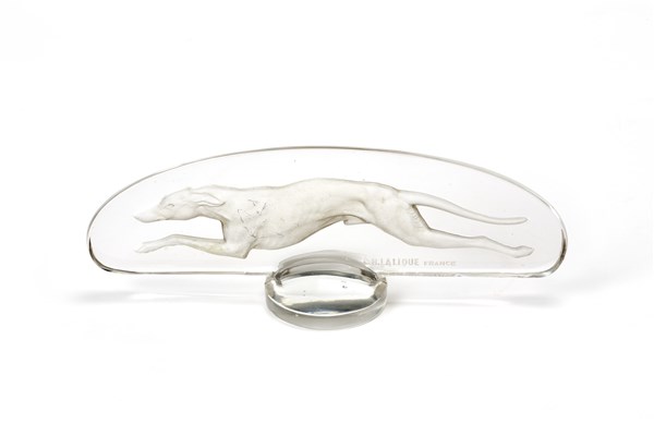 Car cap model "Lévrier". France, 20th century. Transparent colorless mold blown and etched glass. Stamped signature "R. LALIQUE FRANCE". (l 20 cm.)
