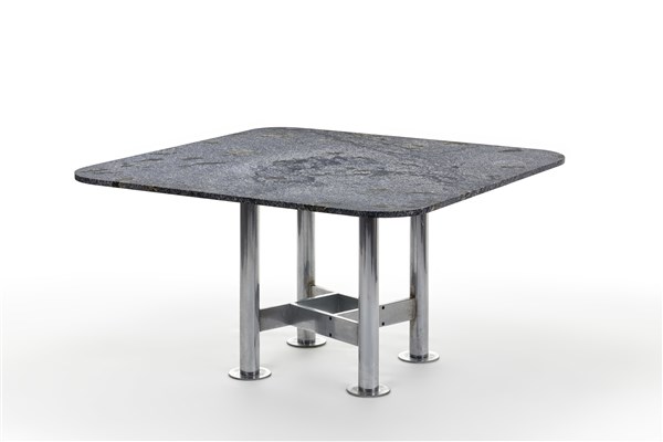 Tavolo con piano quadrato ad angoli arrotondati in granito blu e base in tubolari di acciaio cromato collegati da traverse incrociate. Italia, anni '70. (cm 134x74x134) (lievi difetti)