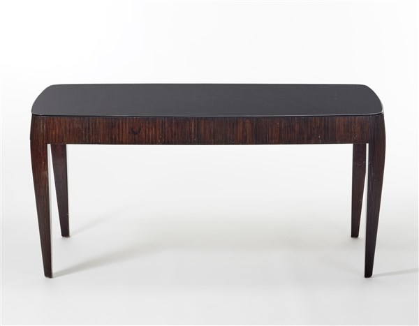 Tavolo allungabile. Italia, anni '40. Gambe e struttura in legno di mogano massello grissinato, piano in opalina nera. (cm 165x79x92) (lievi difetti)