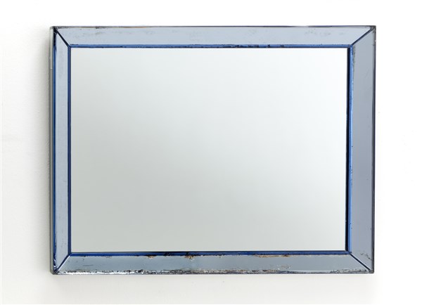Wall mirror with light blue mirrored glass frame, colorless mirrored glass edges, wooden structure. Italy, 1950s. (78x60 cm.) (defects)