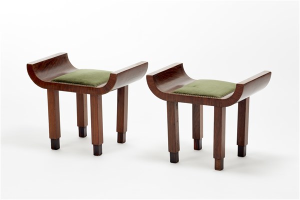 Pair of Novecento stools in veneered wood and upholstered seat covered in green velvet. Italy, 1930s. (55.5x47x35 cm.) (slight defects)
