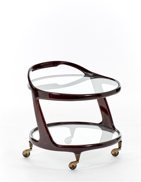 Food trolley. Italy, 1950s. Solid mahogany wood structure, glass shelves. (h 63 cm.; d 63 cm.) (slight defects)
