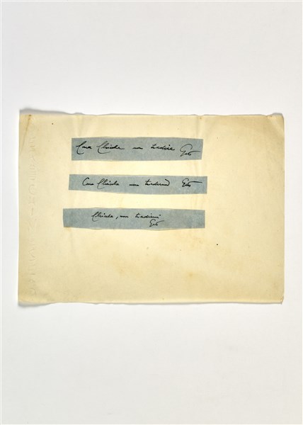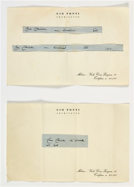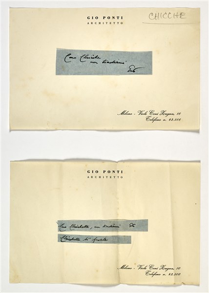 Serie di sei biglietti ironici, composti con la tecnica del collage alla maniera della lettera minatoria. Ideati, scritti e inviati da Gio Ponti a Enrichetta "Chicche" Ritter, redattrice della rivista "Domus". Milano, anni '50. Inchiostro nero su velina azzurra o bianca incollata su biglietti in carta intestata "Gio Ponti Architetto". (cm 16x22) (lievi difetti)