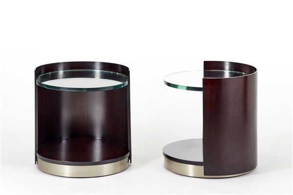 Coppia di comodini cilindrici. Produzione Formanova, Meda, anni '70. Legno laccato nero, un cassetto nella parte bassa, piano in cristallo di forte spessore, base in acciaio spazzolato. (h cm 52; d cm 50) (lievi difetti)