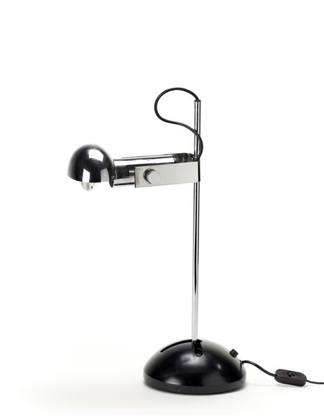 Lampada da tavolo con paralume orientabile. Milano, anni '70. Base in acciaio verniciato nero, fusto e paralume in acciaio cromato e verniciato bianco. Marcata sotto la base. (h cm 50) (lievi difetti)