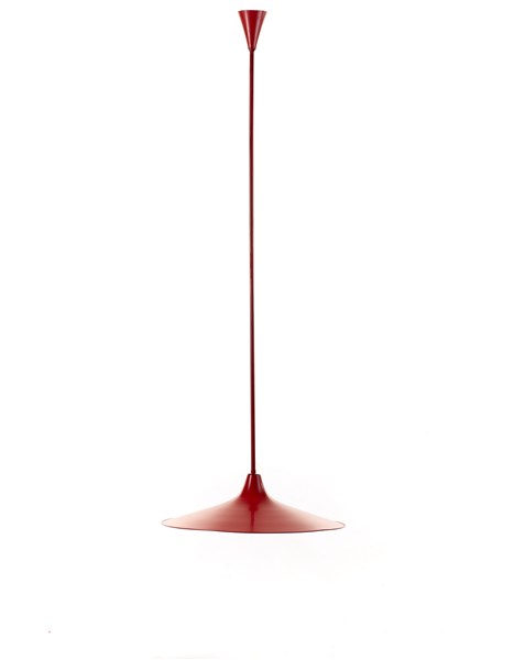 Lotto 321 | Lampada a sospensione con paralume a tromba in metallo verniciato rosso. Italia