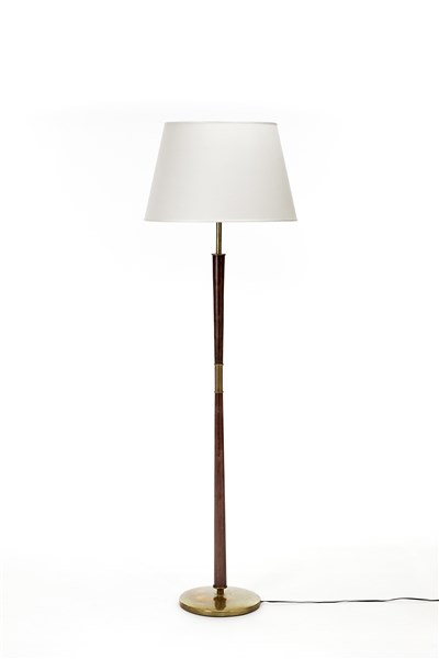 Floor lamp. Milan, 1950s. Stem in mahogany wood and brass, brass base, fabric lampshade. (h 178 cm.) (slight defects)