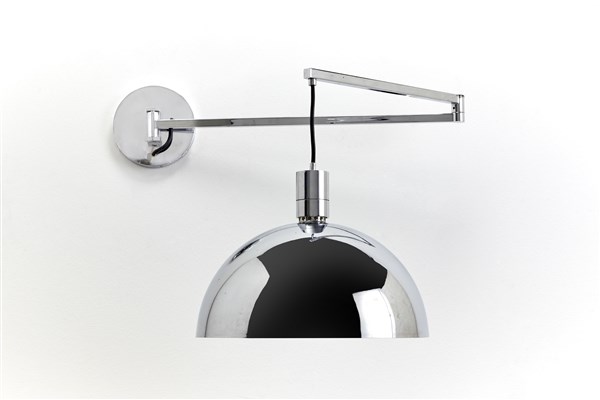 Wall lamp of the series "AM/AS". Produced by Sirrah, Imola, 1960s. Articulated arm and lampshade in chromed and white painted metal. (l arm cm 70+48; d cm 45) (slight defects)