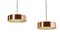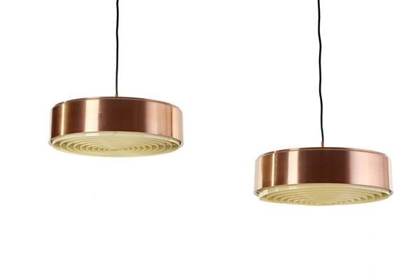 Coppia di lampade a sospensione con elemento diffusore in lamelle in metacrilato opalino e struttura in alluminio trattato rame. Probabile produzione danese. Anni '70/'80. (h cm 13; d cm 45) (lievi difetti)