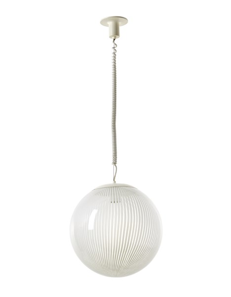 Suspension lamp of the series "Tessuti". Venini, Murano, 1982. Lattimo and crystal cane blown glass, white lacquered steel attachment. (d 42 cm.)