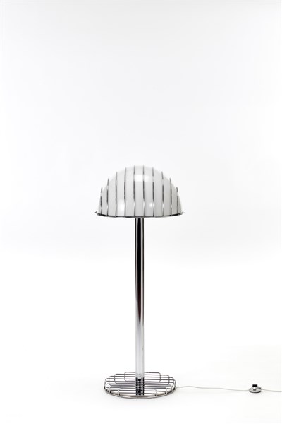 Lampada da terra modello "Griglia". Produzione Esperia, Poggi Bonsi, anni '70. Metallo cromato, metacrilato bianco. Recante etichetta della produzione sull'interruttore. (h cm 114; d cm 44) (lievi difetti)