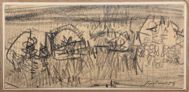 SCANAVINO Emilio (Genova 28/02/1922 - Milano 28/11/1986) Senza titolo, 1959 grafite su cartoncino cm. 8.3 X 18.7 Firma, data 'Scanavino, 59' (in basso a destra) Autentica a cura di Giorgina Scanavino