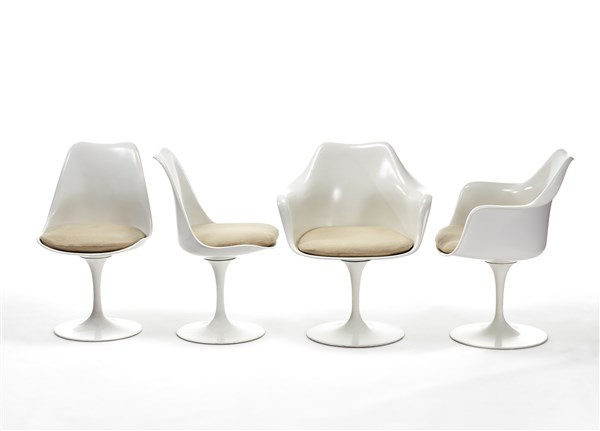 Lotto composto da due sedie e due poltroncine modello "Tulip". Produzione Knoll, USA, disegno del 1956. Fusione di alluminio, vetroresina, Rilsan di colore bianco, cuscini in panno créme. (sedie cm 50x80x50; poltroncine cm 63x80x58)