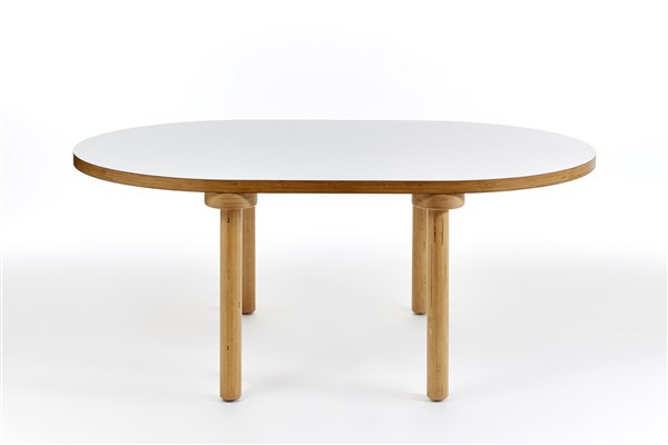 Tavolo modello "Capitello". Produzione Driade, Italia, 1977. Legno chiaro multistrato impiallacciato con laminato bianco. (cm 180x72,5x120) (lievi difetti)