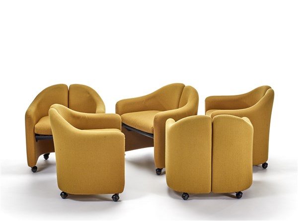 Lotto di cinque poltroncine su rotelle modello "P142". Produzione Tecno, Varedo, 1969. Rivestimento in tessuto color senape. Recanti marchio della produzione. (cm 67x67x57)