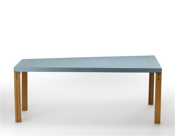 Grande tavolo. Esecuzione Falegnameria Alice dei F.lli Masoero, Torino, 1988. Piano trapezoidale rivestito in laminato Abet Print HPL, quattro gambe in multistrato di MDF e compensato di betulla, giunti di fissaggio a T in acciaio. (cm 207x77x125) (difetti)