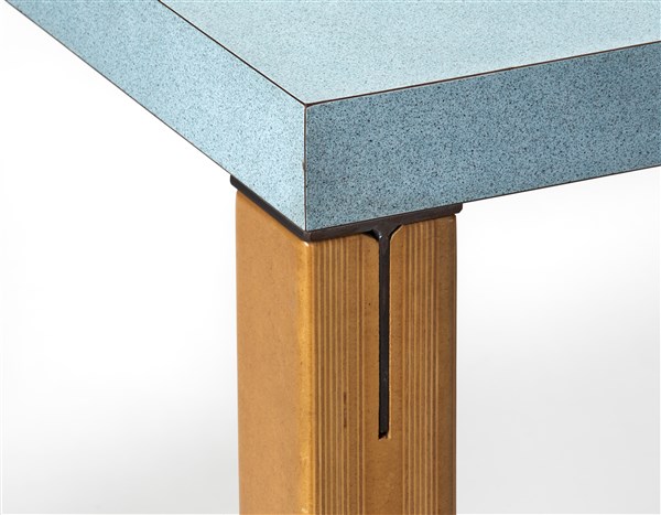 Large table. Execution by Falegnameria Alice dei F.lli Masoero, Turin, 1988. Trapezoidal top covered in Abet Print HPL laminate, four legs in MDF plywood and birch plywood, T-shaped fixing joints in steel. (207x77x125 cm.) (defects)