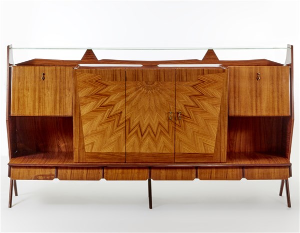 Grande credenza in legno impiallacciato con parte inferiore a sei cassetti, parte superiore pentapartita con fascia centrale a tre ante e parti laterali a ribalta e ripiano. Mensola in cristallo. Italia, anni '50. (cm 275,5x156x50,5) (difetti, piccole mancanze e restauri)