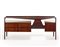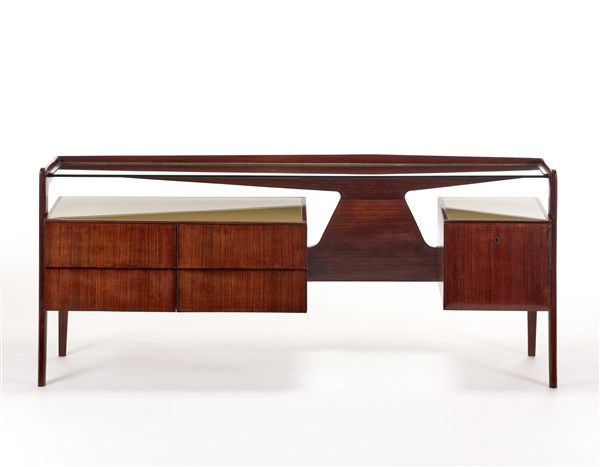 Cassettiera in legno massello e impiallacciato con piano in vetro, piccolo stipo ad apertura dall'alto e cassetti ai lati con sovrapiani in vetro retroverniciato. Italia, anni '50. (cm 180x73,5x51) (difetti e mancanza delle chiavi)