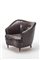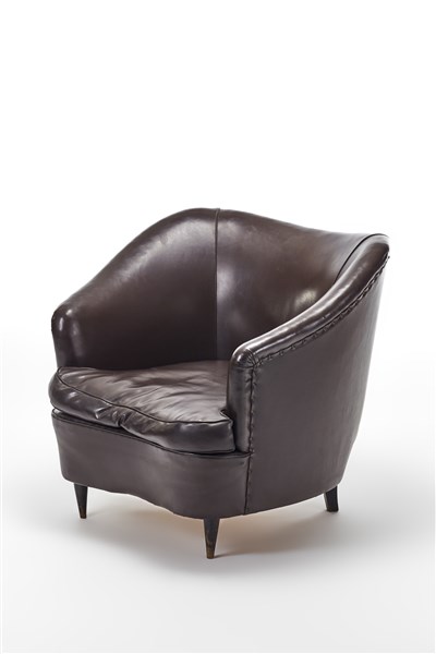 Poltrona imbottita con piedini anteriori troncoconici e posteriori a sezione quadrata. Esecuzione Casa e Giardino, Milano, anni '50. Rivestimento in similpelle marrone, piedini in legno massello. (cm 80x76x80) (lievi difetti)