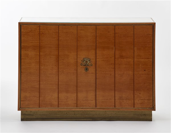 Piccola credenza a due ante con fronte spartito a fasce verticali e toppa decorata con angeli a rilievo. Italia, anni '40. Struttura in legno massello impiallacciato e bordato in citronnier, fusione di ottone, sovrapiano in cristallo molato, base e cornicetta rivestite in lamina di ottone. (cm 125x89,5x35) (lievi difetti)