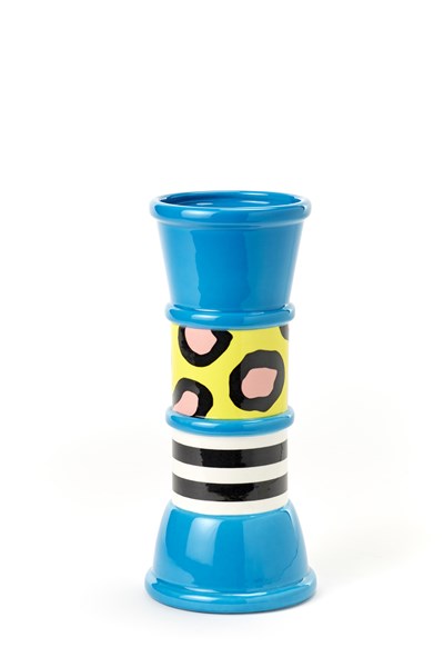 Vaso modello "Carrot". Produzione Memphis, Milano, disegno del 1985. Ceramica smaltata in azzurro con fasce bianco e nero e decoro a macchie nero e rosa su fondo giallo. Marcato sotto la base. (h cm 31; d cm 13)