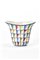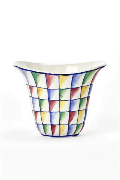 Small vase with widened rim and body with slightly convex rectangular bosses model "5769". Execution by Richard-Ginori S. Cristoforo per Domus Nova - La Rinascente, Milan, 1927ca. Earthenware with "19 T" grid decoration enamelled in blue, yellow, red and green on a white background underglazed. Marked under the base "DOMUS NOVA" in black and with the numeral 86 in gray. (h 13 cm.)