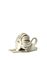 Scultura raffigurante un leone triste accovacciato. Firenze, seconda metà secolo XX. Grès smaltato in bianco opaco e graffita. Firmato "GAMBONE ITALY" sotto la base. (h cm 14)