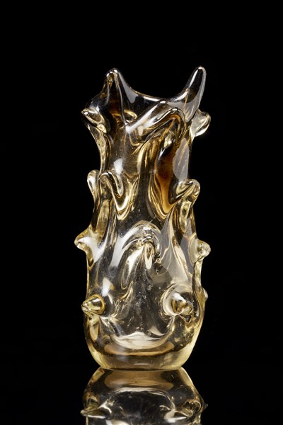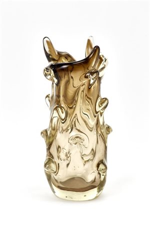 Vase. Execution by Seguso Vetri d'Arte, Murano, 1930s. Heavy transparent topaz glass worked with irregular bosses. (h 21 cm.) (slight defects)