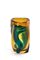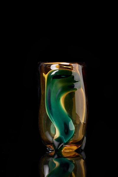 Vase with triangular section. Murano, 1950s. Heavy transparent amber glass with irregular bands in relief in green transparent glass hot applied. (h 26 cm.) (slight defects)