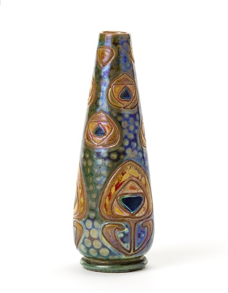 Vasetto Liberty decorato con figure ispirate alle piume di pavone. Esecuzione Fornaci San Lorenzo, Mugello, 1906ca. Maiolica incisa e smaltata a lustro metallico nei toni del verde, vinaccia, ocra e celeste. Marcato sotto la base con il simbolo grafico della grata e iscritto "F - MUGELLO 2242". (h cm 17)