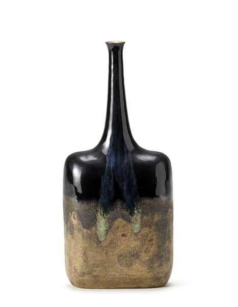 Vaso bottiglia con corpo schiacciato e collo stretto. Firenze, seconda metà secolo XX. Ceramica smaltata in nero lucido, beige e a colature blu-verdi. Firmato "GAMBONE ITALY" sotto la base. (h cm 34,5)