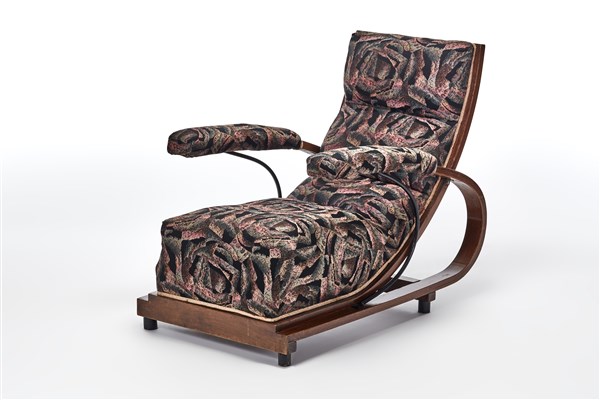 Poltrona. Genova / Milano, 1933. Struttura in legno di noce, braccioli a balestra in legno multistrato curvato. Rivestimento in tessuto policromo nei toni del nero, del grigio e del rosa. Forcella di rinforzo in tubolare metallico, probabilmente non coeva. (cm 68x80x104) (lievi difetti)