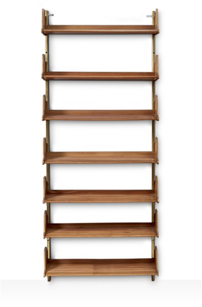 Libreria modello "E60". Produzione Arredamenti Borsani, Varedo, anni '50. Sette ripiani in teak, montanti in alluminio ottonato. (cm 82,5x200x30) (difetti)