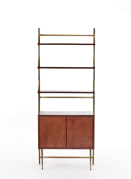 Libreria con tre ripiani a giorno e stipo a doppia anta. Italia, 1960ca. Montanti e reggipiano in metallo ottonato e piani e stipo in legno impiallacciato di teak. (cm 82,5x200x34) (lievi difetti)