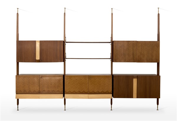 Libreria tre campate rette da puntoni fusiformi in legno di teak massello e impiallacciato con cinque stipi ad anta impiallacciati a coda di rondine e bordati in legno grissinato e due ripiani a giorno in teak impiallacciato e ottone. Italia, anni '50. (cm 373x271x46) (lievi difetti)