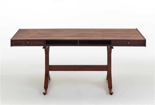 Scrivania modello "530". Produzione Bernini, Ceriano Laghetto (MB), 1961. Fascia sottopiano a quattro cassetti su un lato e a due cassetti e due scomparti sull'altro. Legno di teak massello multistrato e impiallacciato. (cm 170x72x82,5) (difetti)