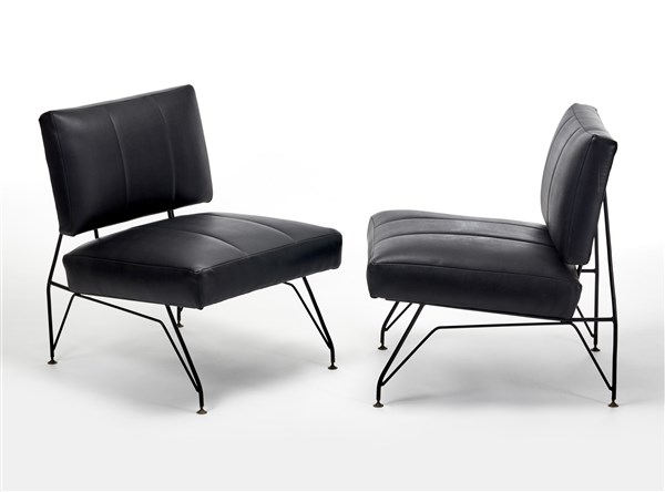 Coppia di poltrone con struttura in tondino di acciaio verniciato nero e rivestimento in similpelle nera. Italia, anni '60. (cm 59x77x70) (difetti e piccole mancanze)
