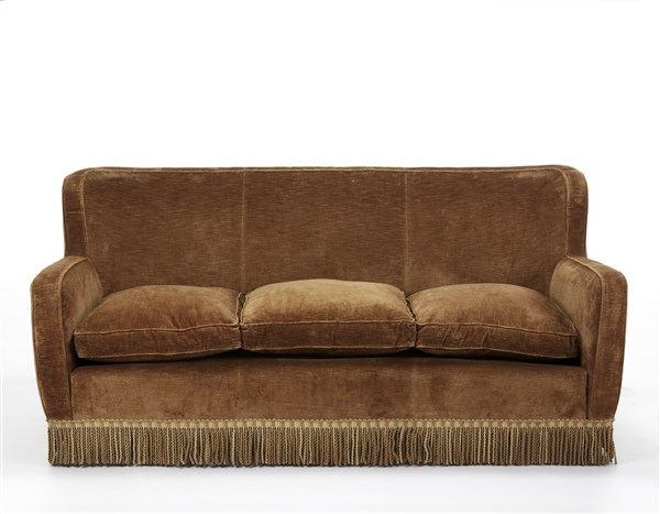 Divano a tre posti con struttura in legno massello, gambe troncoconiche, rivestimento in velluto color senape. Milano, anni '40. (cm 168x77x74) (lievi difetti)