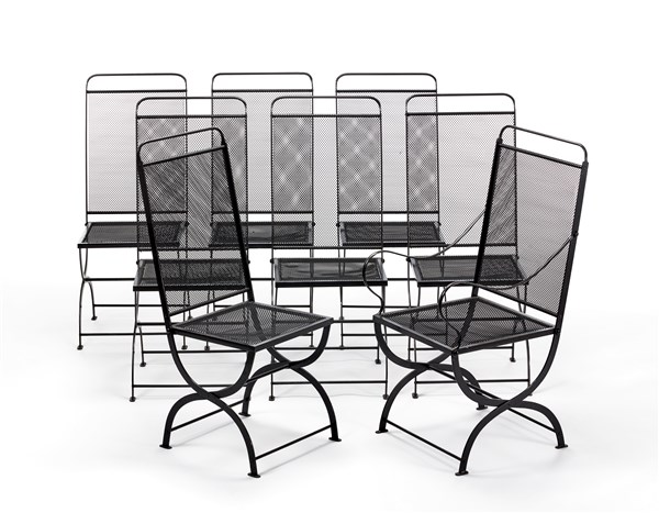 Lotto composto da sette sedie e una poltroncina modello "Nonaro". Produzione Azucena, Milano, 1959. Ferro grigio metallizzato e rete metallica in filo di ferro zincato. (sedie cm 41,5x102x41; poltroncina cm 44x101x51) (lievi difetti)