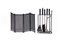 Attrezzi da camino ed un parascintille. Produzione Dimensione Fuoco, Italia, 1980ca. Metallo, ottone e legno di rovere tinto. (misure diverse) (lievi difetti)