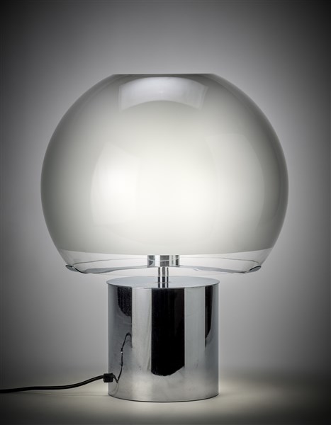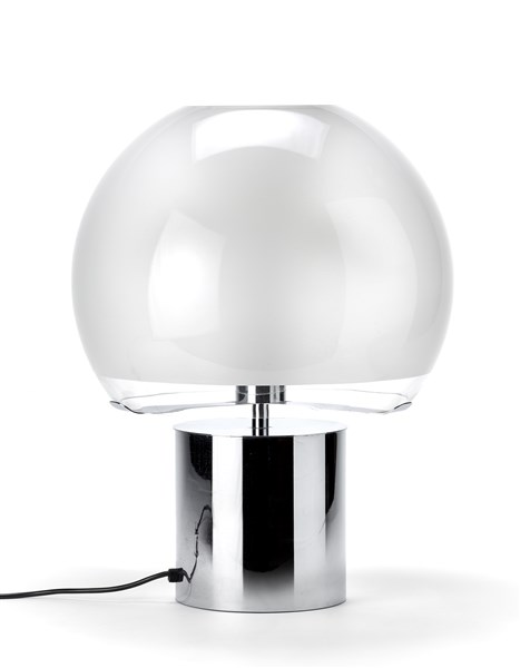 Lampada da tavolo modello "LTA6 Porcino". Produzione Azucena, Milano, disegno del 1967. Base cilindrica in metallo cromato, diffusore in vetro soffiato smerigliato sulla superficie interna. (h cm 57,6)
