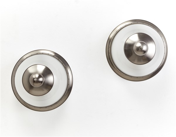 Coppia di lampade da parete modello "Mezzo lampione". Produzione Azucena, Milano, anni '50. Struttura in ottone nichelato e calotta in vetro lattimo acidato sulla superficie interna. (d cm 35) (lievi difetti)
